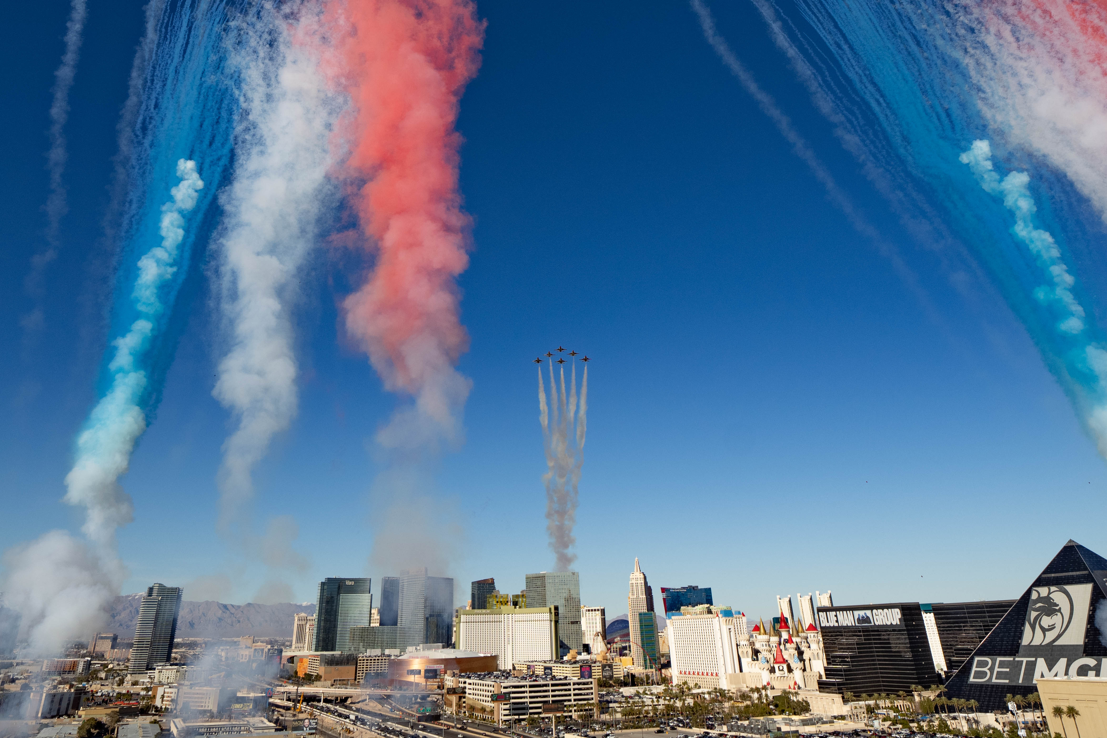 Smoke on, ready now. Las Vegas is all about spectacle and the Thunderbirds understood the assignment. With red, white and blue fireworks and the Las Vegas Strip in the background, the Team proudly kicked off the big game with an iconic flyover in their hometown.